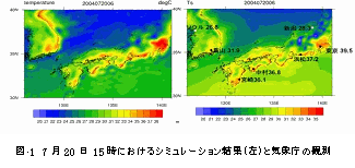 大気・海洋グループでは、週、季節単位から年単位の気象・気候変動を予測するためのシミュレーションプログラムの開発を行っています。ハインドキャストシミュレーション研究(ある現象を再現することによって後から行う擬似的予測)の一例として、平成16年7月20日に東京で39.5℃を記録した太平洋側の猛暑と、その2日前におきた福井県の集中豪雨の原因解明について紹介します。平成16年7月15日の気象庁提供の観測データを初期値として、5日間の全地球のシミュレーションを行った結果、偏西風が蛇行することによって、ユーラシア大陸の中緯度に、高気圧と低気圧が互いにいくつも隣り合う形となって(シルクロードに沿って波状に形作られるので「シルクロードパターン」と名付けました)、日本の南西部に強い高気圧が発生しました。この結果、日本海側、特に福井県に集中豪雨が降り、多大な被害をもたらすと同時に、その2日後に、太平洋側にフェーン現象が起きて、猛暑となったわけです(図-1)。このことは、偏西風の蛇行のような地球規模の大規模変動に伴う豪雨や猛暑は、3〜5日前位から予測が可能であることを示しています。