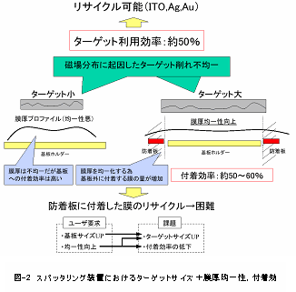 A:スパッタ装置の構成により大きく変わる数値ではあるが、ターゲット利用効率は約50%、ターゲットから飛び出した材料のうち基板に付着する効率が50〜60%、両者の積から25〜30%程度の成膜効率となる。ターゲット利用効率分はリサイクル回収出来ているので残りの付着効率が問題となる。付着効率は向上させにくい。近年ユーザー側より成膜装置に高い膜厚均一性が要求されているためである。基板中央部分と同じ膜厚を基板の端に成膜しようとすれば当然基板に付着せず防着板につく膜が増加しロスとなる。装置メーカーとしては、基板を移動し成膜する機構をとる等の工夫で効率を改善する事は可能だが複雑な機構を装置に搭載する事で価格やトラブル発生の可能性が増加する。難しい問題といえる。