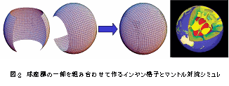 固体地球グループでは、地球内部の構造とその時間発展を解明するために、新しい格子系や革新的なシミュレーション手法の開発、先進的なデータ解析手法の開発を行っています。ここでは、地球内部のコアやマントル対流のシミュレーションのために開発した、全く新しい格子系、「インヤン格子系」をご紹介します。この格子系は、固体地球シミュレーションだけでなく、後でご紹介する台風の動きを予測するための大気・海洋シミュレーションや、地球磁気圏、天文学のシミュレーションなどにも応用されています。インヤン格子は、図-2に示すように2つの球座標系の一部を組み合わせてできているもので、従来の球座標の不必要に集中した格子による計算時間の長大化が防げ、しかも、解像度の高いシミュレーションを短い時間で実行することができます。図-2の右端に、インヤン格子を用いたマントル対流のシミュレーション結果を示しました。
