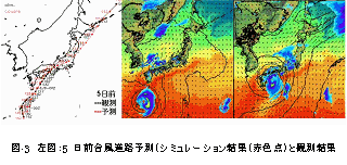 全地球を水平方向10kmの格子点で切ってシミュレーションをしながら、同時に、日本を取り囲む2,000〜3000kmの領域を1kmの格子点で切って、詳細にシミュレーションします。図-3は、台風の5日予測の結果です。右図で等圧線極値部分の影が台風の雨雲で、海表面温度を高温から低温になるに従って、濃灰色→淡灰色で示しています。台風の進路がかなり正確に予測できること、また、台風の通過と共に、風が強く、海水がよくかき回される台風の進路の右側の海水温度が下がることがよくわかります。