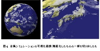 高度計算表現法研究グループでは、大規模なシミュレーションで得られた膨大なデータについて、効率の良いデータ処理法やその可視化に関する研究開発を行っています。特に可視化については、BRAVEと呼ばれる装置を用いた3次元バーチャルリアリティ表現に必要なソフトウェアの開発や、様々な可視化表現、更に、1ショット1ギガバイトのシミュレーションデータを1,000枚分、1テラバイトという膨大なデータを1日で動画化することも可能になりました。図-4は台風シミュレーションの結果を可視化したものです。