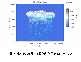 図-5は地球シミュレータセンターにおいて世界で初めて実現された第1原理雲形成シミュレーションの結果です。雲形成は大気の放射過程を通して温暖化に重要な影響を与えると考えられていますが、マクロスケールの大気力学の中でミクロスケールのエアロゾル・雲相互作用を正確に取り扱う方法論はまだ確立されていません。このことは温暖化予測の不確定性を大きくする主たる原因の一つにもなっています。私たちは「超水滴法」と名づけた新しいモンテカルロシミュレーションを大気シミュレーションと連結することにより、雲凝結核の化学種と質量、水滴の運動論、凝結成長、衝突併合などを第1原理から取り扱うことに成功しました。現在、さらに大規模な大気循環と雲微物理の相互関係を明らかにする研究を進めていますが、その成果は精密な降水予測や人工降雨の最適化などにも利用することができると考えられます。