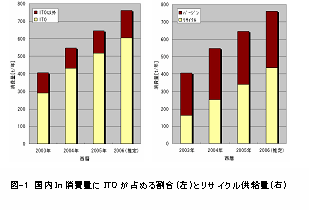 ・Inのリサイクルフロー FPD用透明導電膜として使用されるITO(In2O3+SnO2)中のInは供給不足が懸念されており価格が1年で10倍に高騰している材料2),3)。Inは8割がITOターゲット材へ利用され、国内総消費量760t/年のうち、リサイクルによるものが430t/年、約60%を占めている。製造工程でのターゲット端材と使用済みターゲットからリサイクルするシステムが出来ている。防着板からのリサイクルは現状出来ていない。ただし、このようなリサイクルが進んでいるケースは貴金属とTa、ITO(In)くらい。レアメタルの中でもTi、Mo、WはIn、Taと比較してリサイクルが進んでいない。Moを例にとると、純粋なMo材としてではなく鉄鋼の添加剤として再利用されることはある。